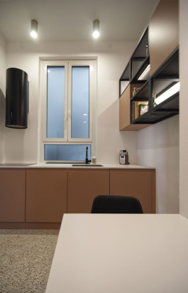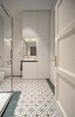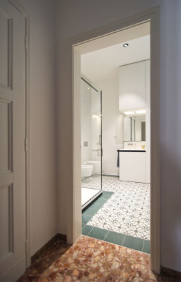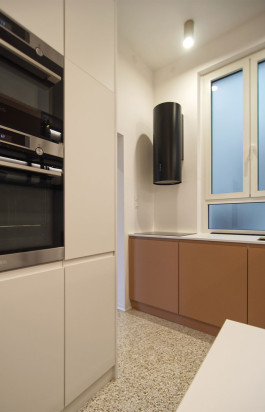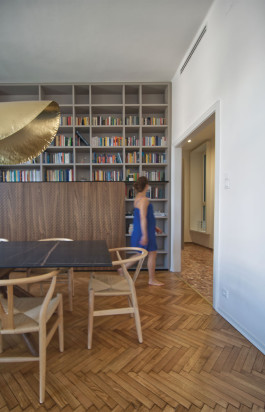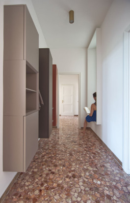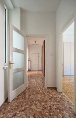 ENG - The renovation of this 1950s apartment in the center of Udine is an example of a redevelopment that blends modern aesthetics and functionality, respecting the original soul. The bathroom underwent a complete overhaul: the old ceramic flooring was removed, replaced with new geometric patterned tiles in light and aqua green, and modern, minimalist fixtures and furnishings were installed. The kitchen was also completely renovated, with a clean design, dove gray and coral-colored cabinets, and open cabinets. The induction hob and black designer hood emphasize the modern and practical feel of the space. In the hallways and passageways, the original Venetian terrazzo flooring was expertly preserved and enhanced. With its reddish and beige marble fragments, it is a distinctive feature of period apartments, lending character and authenticity. It harmonizes perfectly with the sanded and matte-finished herringbone oak parquet. The ceilings in these rooms were lowered to accommodate the air conditioning system: a functional, invisible intervention. A built-in bench with a protruding windowsill was added to the entry hallway, transforming it into a more welcoming and brighter space. In the living room, a large wall-mounted bookcase not only houses the owner's extensive collection but also serves as a dramatic backdrop for the generous dining table, illuminated by a bent brass pendant light.