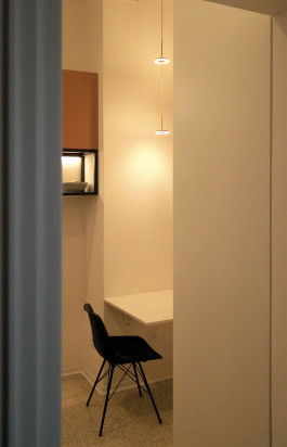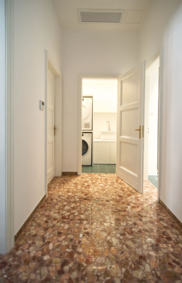 ITA - La ristrutturazione di questo appartamento anni '50 nel centro di Udine è un esempio di riqualificazione che fonde estetica moderna e funzionalità, rispettando l'anima originale. Il bagno ha subito un rifacimento totale: rimosso il vecchio pavimento ceramico, è stato posato un nuovo rivestimento con motivi geometrici in tonalità chiare e verde acqua, e installati sanitari e arredi moderni e minimalisti. Anche la cucina è stata completamente rinnovata, con un design pulito, basi color tortora e corallo e pensili a giorno. Il piano a induzione e la cappa di design nero sottolineano la modernità e praticità dello spazio. Nei corridoi e disimpegni è stato sapientemente conservato e valorizzato l'originale pavimento in seminato veneziano, che con i suoi frammenti di marmo dai toni rossastri e beige, è un tratto distintivo degli appartamenti d'epoca e conferisce carattere e autenticità, e si armonizza perfettamente con il parquet in rovere a spina di pesce levigato e verniciato opaco. Il soffitto di questi ambienti è stato ribassato per integrare il sistema di condizionamento: un intervento funzionale invisibile. È stata aggiunta una panca integrata con davanzale sporgente nel corridoio di ingresso, trasformandolo in uno spazio più accogliente e luminoso. In soggiorno, una grande libreria a parete non solo custodisce l'ampia collezione del proprietario, ma funge anche da scenografica cornice per il generoso tavolo da pranzo, illuminato da una sospensione in lamina di ottone piegato.