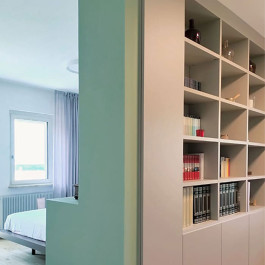 ENG - The renovation project involved a three-story linear building in Gemona del Friuli, aiming to reconfigure the interior spaces to meet the client's new needs and improve energy efficiency. The primary goal was to concentrate the living area on the ground floor and the sleeping area on the first. To this end, the kitchen was moved to the ground floor, merging it with the dining room into a single, convivial space. On the first floor, the former kitchen and living room were transformed into a spacious double bedroom, complete with a walk-in closet, eliminating the dividing door to create continuity. The first-floor bathroom was enlarged by partially demolishing a partition in the hallway. A shower was installed in an alcove and the sink was repositioned, optimizing space and functionality. The rooms are all characterized by an earthy and natural color palette (sage green, terracotta, light wood) balanced with touches of white and gray, maximizing natural light, complemented by integrated lighting. Finally, all the obsolete wooden windows and doors were replaced with new aluminum ones. This choice significantly improved thermal and acoustic insulation, enhancing the building's living comfort and energy efficiency.