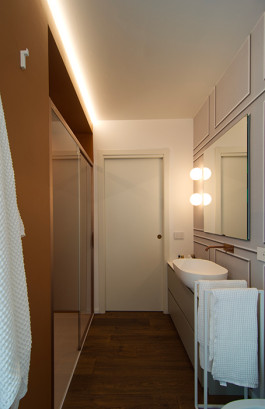 ENG - An interior design project transforms a newly built apartment in the heart of Udine into a welcoming, refined space perfectly tailored to the client's needs, with a focus on the kitchen and living area. The overall aesthetic is cohesive, defined by neutral tones enhanced by colorful accents and various textures. The warm wood parquet flooring unifies the spaces, creating a harmonious contrast with the cooler, sleeker surfaces. Modern lighting enhances the contemporary atmosphere. The open-plan living area seamlessly integrates the kitchen and living room. The custom-designed kitchen features clean lines, light-colored cabinetry, and a dark central island, the latter lightened by a mirrored cladding that lightens its mass. The dining area is graced with a glass table and blue velvet chairs. The master bedroom offers a serene retreat, featuring a low bed with a bronze finish and a custom-made blue-gray headboard, complete with built-in nightstands and wall lighting. The bathrooms, both contemporary and functional, are meticulously designed. The master bathroom, with an oval sink suspended from a neutral vanity, balances the brick-colored accent wall. The second bathroom, with a more assertive character, adopts a monochromatic aesthetic.
