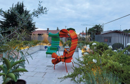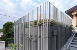 ENG - The project stems from the need to expand the functionality of the existing home, with a new garage capable of accommodating cars, bicycles, and motorcycles, along with a tool shed. Located at the center of the lot and surrounded on three sides by a garden, the house designed by architect Simonitti is now enhanced by two stereometric volumes positioned on the north side, where the driveway was previously located. The garage abuts the street, allowing for the restoration of much of the existing driveway. Its roof is transformed into a lush flowerbed that embraces the terrace, serving as a new open-air, south-facing living room, restoring permeability to the lot and a livable outdoor space. The rational geometry of the new volumes is enlivened by a cladding of square-section aluminum tubes, creating a vibrant façade effect inspired by the Fibonacci series. This cladding has multiple functions: it evens out and gives three-dimensionality to the exposed reinforced concrete, acts as a parapet, masks the recycling bins, and conceals the overhead door and bicycle exit. The green roof basin hosts shrubs that, as they grow, will blend with the metal stems, evoking a bamboo forest. The tool shed, with narrow openings that echo the home's glass windows, harmonizes with the garage in dark, earthy tones. The project also includes a canopy for the main pedestrian entrance. All existing gates are replaced with custom models that match the garage cladding. The exterior lighting is designed to enhance the green basin, the metal cladding, the new north-facing garden, and the pedestrian entrance. The Piasentina stone paving adds to the elegance of the project. The home stands out against the dark base of the new volumes and garden, emphasizing the architectural hierarchy. The warm gray hues of the volumes and cladding lend a minimalist sophistication, infusing harmony into the entire context.
