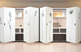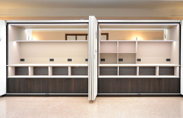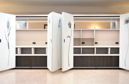 ENG - The custom-built buffet for the Hotel Astoria in Udine is a functional and elegant design solution, divided into two symmetrical blocks with curved sides. Its highlight is the retractable folding door mechanism, which allows the contents to be completely hidden or exposed, optimizing space in the breakfast room. The interior is highly organized with LED-lit open compartments and mirrors for displaying food and drinks, and intermediate shelves equipped with integrated electrical outlets, essential for equipment. The lower section features open compartments and closed cabinets for discreet storage. The materials chosen combine warm dark wood with light finishes that harmonize with the tones of the breakfast room. The distinctive touch is the exterior doors covered with wallpaper depicting elegant, stylized botanical illustrations, which lend a unique, artistic character to the cabinet, transforming it into a harmonious furnishing element. Made by: Falegnameria Rizzi