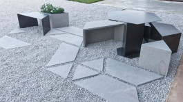 ITA - Un sistema di sedute, tavoli, fioriere e lastre a pavimento caratterizzati da forme stereometriche decise che si incastrano tra loro a formare un vero e proprio puzzle. Il riferimento al "tangram" costituisce la chiave di lettura fondamentale di questo sistema. Non si tratta solo di elementi con forme geometriche nette, ma di moduli che, come i pezzi del celebre puzzle cinese, sono stati concepiti per comporre infinite configurazioni. Un gioco di forme in cui il ferro incontra la pietra Piasentina. Il ferro, con le sue linee nette e moderne, definisce le strutture e conferisce leggerezza visiva. La pietra Piasentina, rocciosa e dalle tonalità calde, apporta solidità, matericità e un senso di radicamento. I due materiali si esaltano a vicenda: la precisione del ferro valorizza la texture della pietra, mentre la pietra ammorbidisce le geometrie del ferro. Realizzato da: Area Inox e millimetri 4.