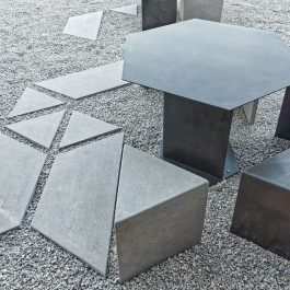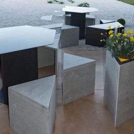 ENG - A system of seats, tables, planters, and floor slabs featuring bold, stereometric shapes that fit together to form a veritable puzzle. The reference to the "tangram" is the key to understanding this system. These aren't just elements with clear geometric shapes, but modules that, like the pieces of the famous Chinese puzzle, were designed to create infinite configurations. A play of forms in which iron meets Piasentina stone. The iron, with its clean, modern lines, defines the structures and lends visual lightness. The Piasentina stone, rocky and with warm hues, adds solidity, texture, and a sense of grounding. The two materials enhance each other: the precision of the iron enhances the texture of the stone, while the stone softens the geometry of the iron. Made by: Area Inox and millimetri 4.